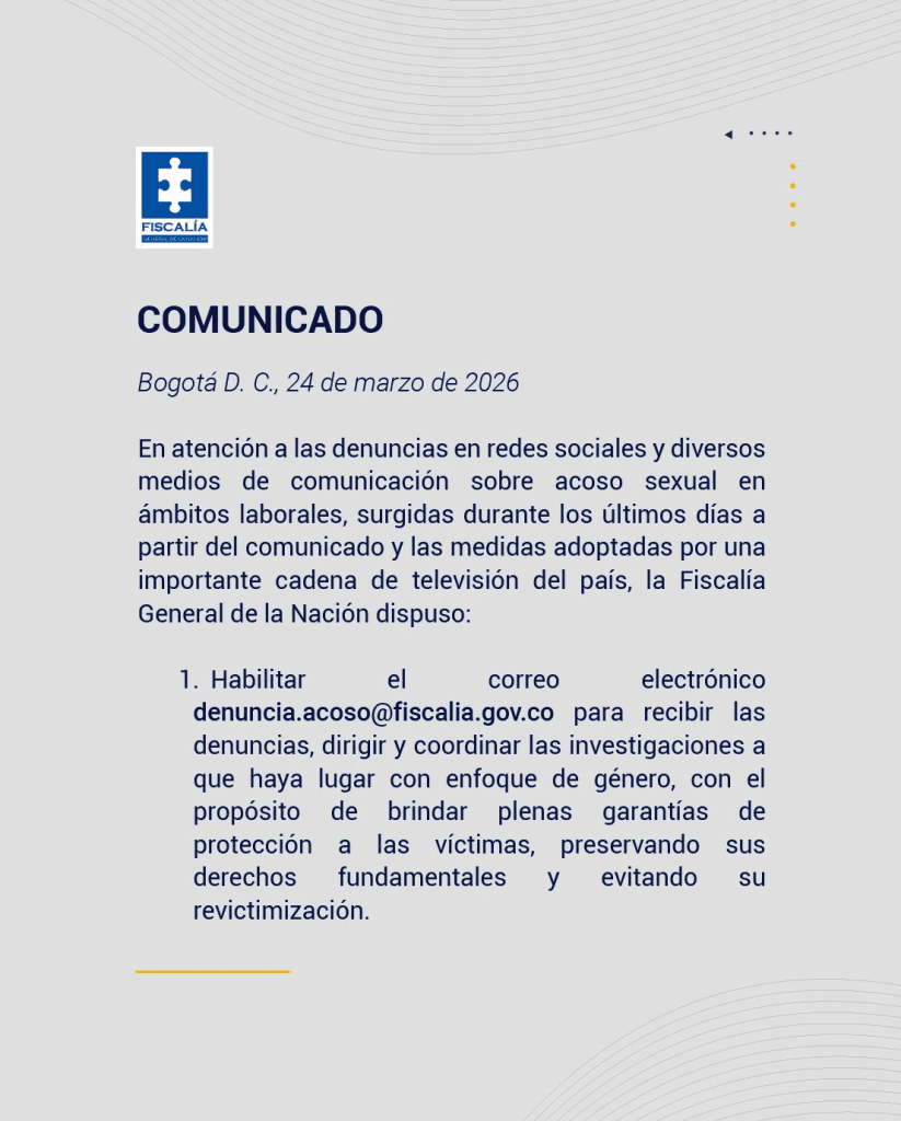 - Lunes 23 de marzo: La Fiscalía General anunció la apertura de una noticia criminal y habilitó un correo específico para que las posibles víctimas aporten sus testimonios, garantizando un enfoque de género y protección contra la revictimización.