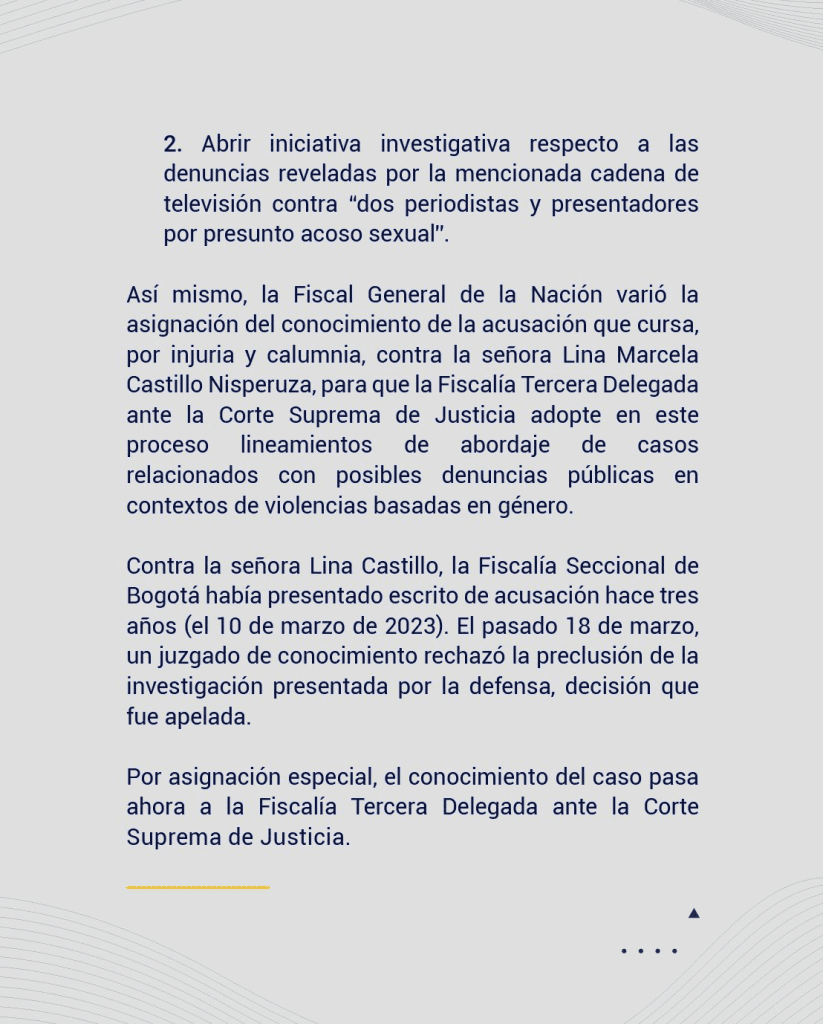 - Domingo 22 de marzo: La periodista Juanita Gómez se sumó a las voces de apoyo recordado incidentes similares ocurridos en 2015, señalando que ciertas figuras utilizaban su estatus de poder para amedrentar a colegas más jóvenes.