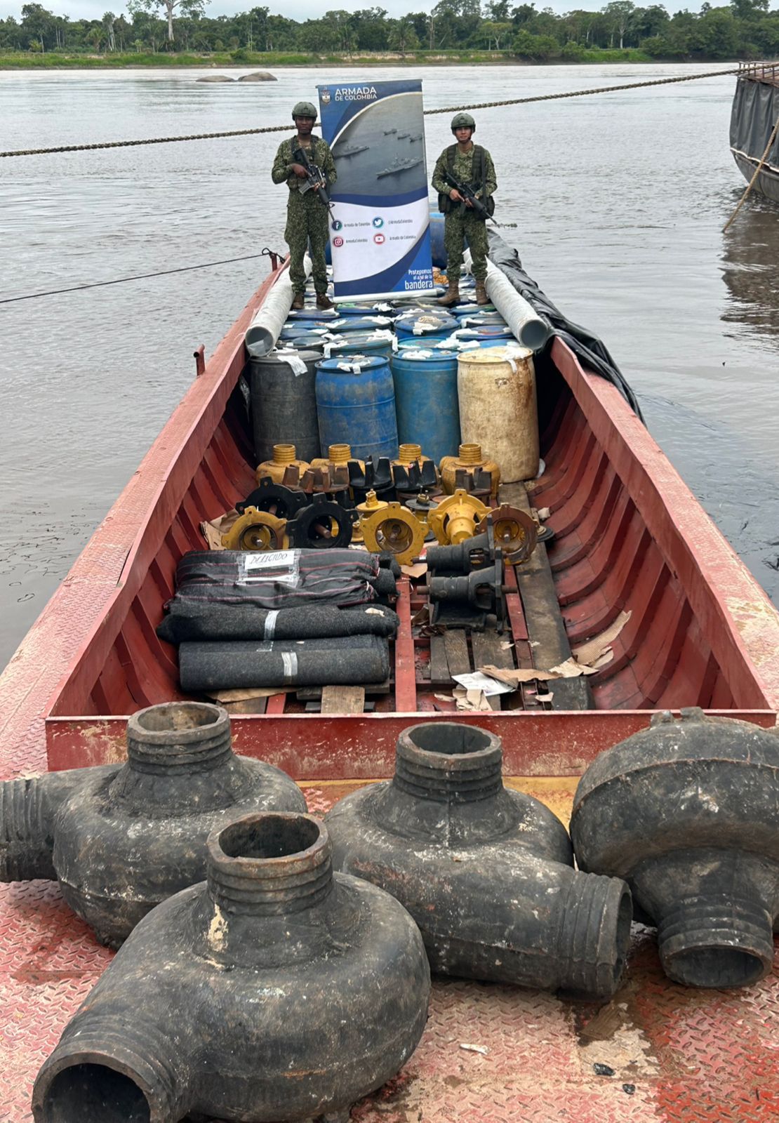 Lo más alarmante para las autoridades fue el hallazgo de diversos elementos que, según la inteligencia militar, serían utilizados para la construcción de una Unidad Productora Minera (UPM). La minería ilegal es una de las mayores amenazas ambientales en el Guainía, causando daños irreparables en los ecosistemas fluviales debido al uso de químicos y la remoción de sedimentos. Al no contar con documentación que acreditara la procedencia legal del combustible ni de los materiales, la carga fue decomisada de inmediato.