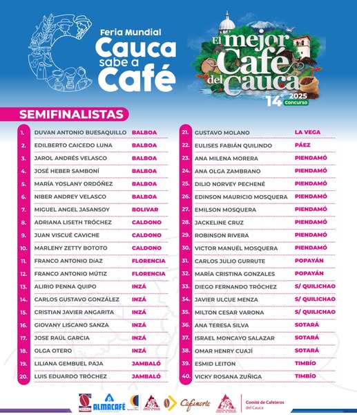 La lista de estos talentosos caficultores semifinalistas es un testimonio del arduo trabajo y la pasión que caracteriza a la región. De este selecto grupo, se elegirán a los diez finalistas que competirán por el prestigioso título. La tensión y la expectativa son altas, y la comunidad cafetera espera con ansias el próximo sábado 16 de agosto, día en el que se anunciará al ganador o ganadora del certamen.